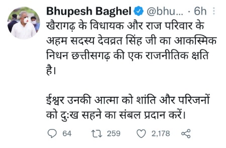 छत्तीसगढ़ के सीएम भूपेश बघेल ने देवव्रत सिंह के निधन पर शोक जताया है। उन्होंने ट्वीट में लिखा, ‘खैरागढ़ के विधायक और राज परिवार के अहम सदस्य देवव्रत सिंह जी का आकस्मिक निधन छत्तीसगढ़ की एक राजनीतिक क्षति है। ईश्वर उनकी आत्मा को शांति और परिजनों को दुःख सहने का संबल प्रदान करें।’