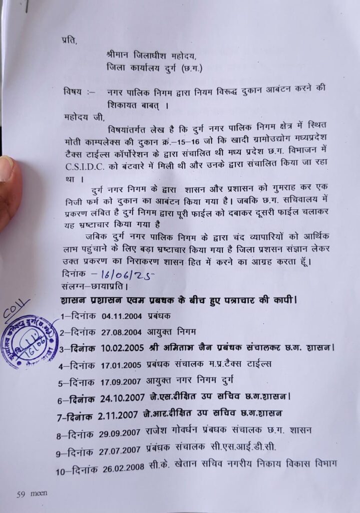 छत्तीसगढ़ के दुर्ग शहर से बड़ी खबर सामने आई है जहाँ नगर पालिका निगम द्वारा नियमों को ताक पर रख कर मोती काम्प्लेक्स में स्थित दुकानें भ्रष्ट तरीके से आवंटित की गई हैं। सय्यद आसिफ़ अली ने जिलाधिकारी दुर्ग को लिखे पत्र में आरोप लगाया है कि खादी ग्रामोद्योग मध्यप्रदेश टैक्स टाइल्स कॉरपोरेशन द्वारा संचालित ये दुकानें पहले मध्य प्रदेश-छत्तीसगढ़ विभाजन के बाद सीएसआईडीसी को मिली थीं। इसके बाद दुर्ग नगर निगम ने प्रशासनिक ताकत का दुरुपयोग करते हुए इन्हें किसी निजी फर्म को हस्तांतरित कर दिया।