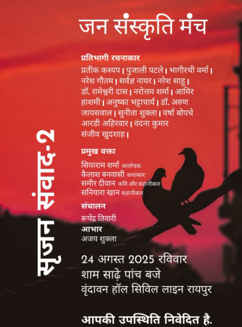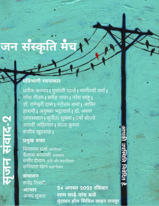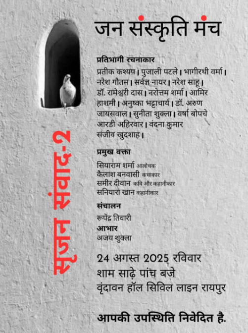 जसम रायपुर के सचिव इंद्र कुमार राठौर ने प्रेस विज्ञप्ति जारी कर बताया कि “सृजन संवाद” का उद्देश्य सिर्फ साहित्यिक अभिव्यक्ति नहीं, बल्कि समाज में रचनाशीलता और जनचेतना का सेतु बनाना है।