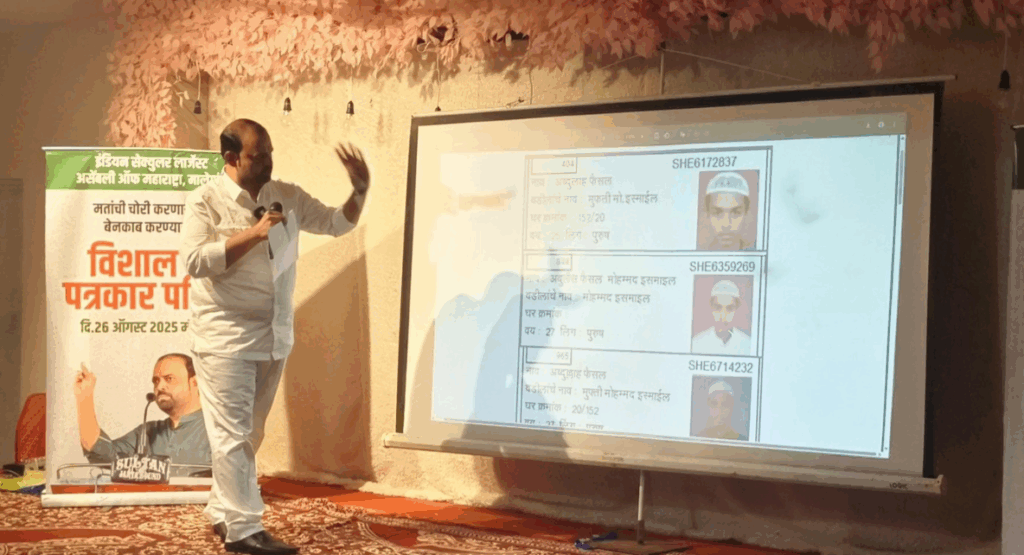 मालेगांव, 27 अगस्त 2025। मालेगांव सेंट्रल विधानसभा क्षेत्र से लोकतंत्र को झकझोर देने वाली खबर सामने आई है। पूर्व विधायक आसिफ़ शेख़ राशीद ने प्रेस कॉन्फ्रेंस में खुलासा किया कि इस क्षेत्र में 42,821 वोट फर्जी तरीके से रजिस्टर किए गए हैं। उन्होंने प्रोजेक्टर स्क्रीन पर सबूत दिखाते हुए बताया कि यह कोई मामूली गलती नहीं बल्कि खुली वोट चोरी और लोकतंत्र के साथ धोखा है।