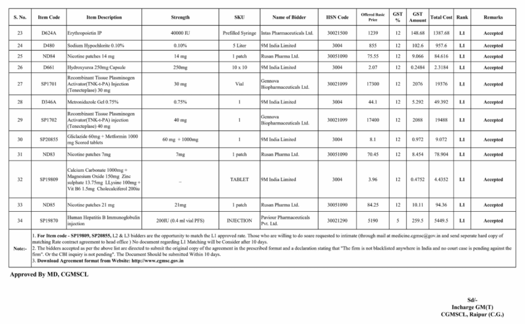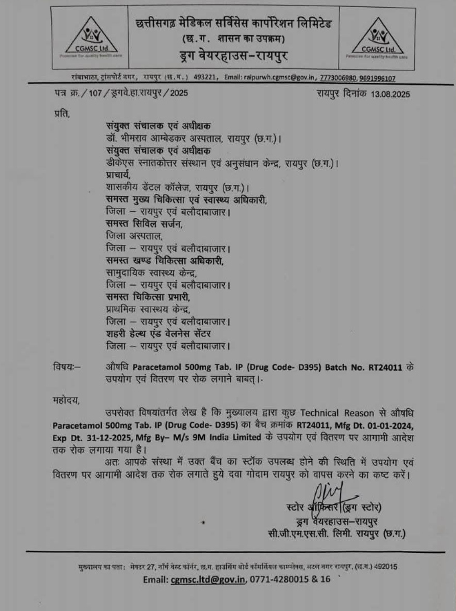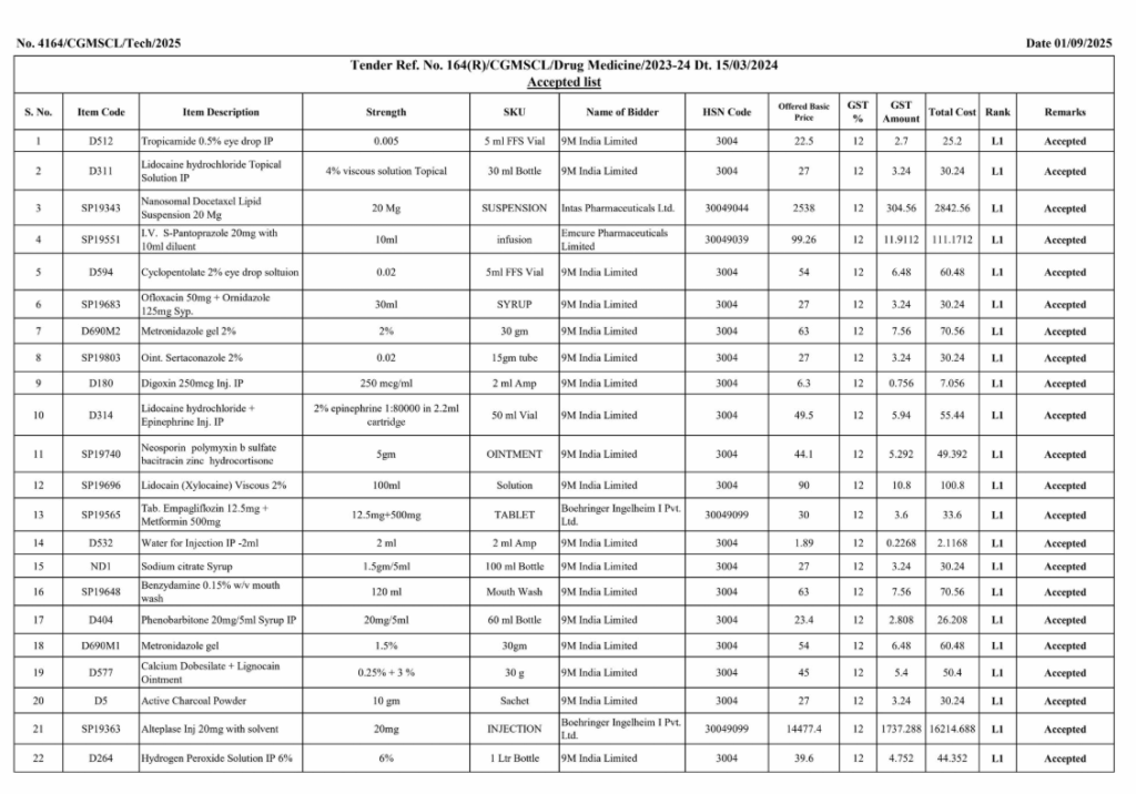 सीजीएमएससी (CGMSC) के टेंडर क्रमांक 164 के अंतर्गत कुल 34 दवाओं की स्वीकृति मिली, जिनमें से 23 दवाओं का ठेका केवल 9m इंडिया को दिया गया। सवाल यह है कि जो कंपनी ब्लैकलिस्ट होने की कगार पर थी, वही अब सरकारी अस्पतालों को दवाएँ सप्लाई करने की जिम्मेदारी कैसे पा गई?