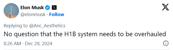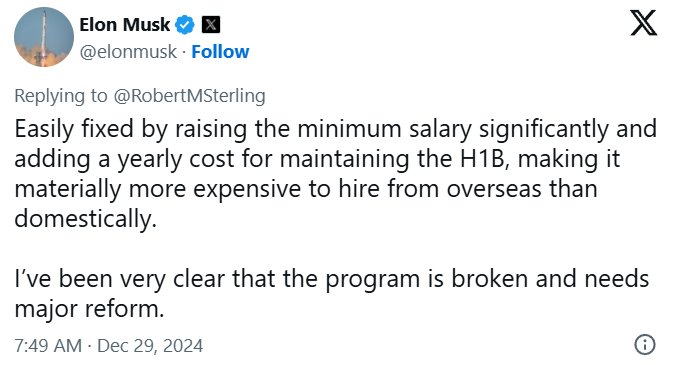हालांकि, कुछ ही घंटों बाद उनका रुख बदल गया। उन्होंने ट्वीट करके लिखा कि H-1B वीज़ा सिस्टम “टूटा हुआ है और इसमें बड़े सुधार की ज़रूरत है”। उन्होंने सुझाव दिया था कि वीज़ा पर न्यूनतम वेतन बढ़ाया जाए और इसे बनाए रखने के लिए कंपनियों से सालाना शुल्क लिया जाए, ताकि घरेलू कर्मचारियों की भर्ती को बढ़ावा मिल सके।