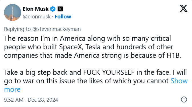 दक्षिण अफ्रीका में जन्मे मस्क खुद अमेरिका में वीज़ा सिस्टम की वजह से बस पाए। उन्होंने पहले H-1B वीज़ा प्रोग्राम की जोरदार वकालत की थी और यहां तक कह दिया था कि अगर इसे खत्म करने की कोशिश हुई तो वे “जंग छेड़ देंगे”। मस्क ने कहा था, “स्पेसएक्स और टेस्ला जैसी कंपनियों को बनाने वाले कई अहम लोग H-1B की वजह से ही अमेरिका में हैं।”