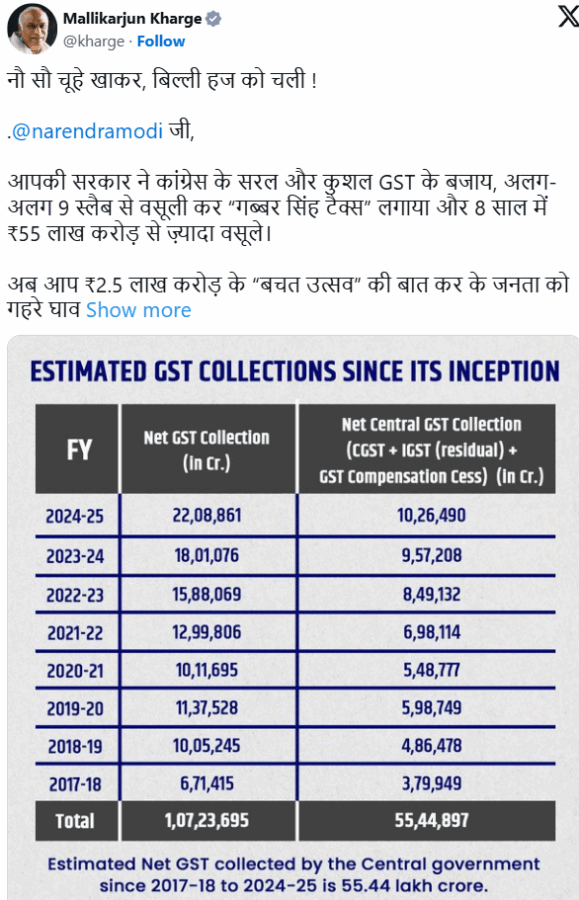 उन्होंने आरोप लगाया कि मोदी सरकार ने जनता पर नौ अलग-अलग स्लैब लगाकर आठ वर्षों में 55 लाख करोड़ रुपये वसूले और अब 2.5 लाख करोड़ रुपये की ‘बचत’ की बात कर रहे हैं।
