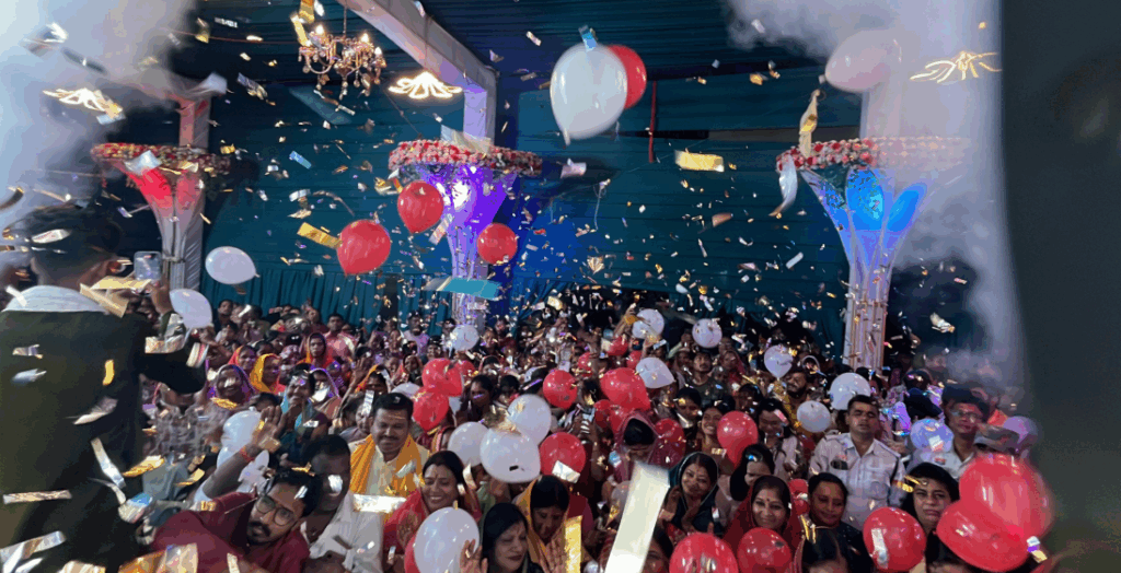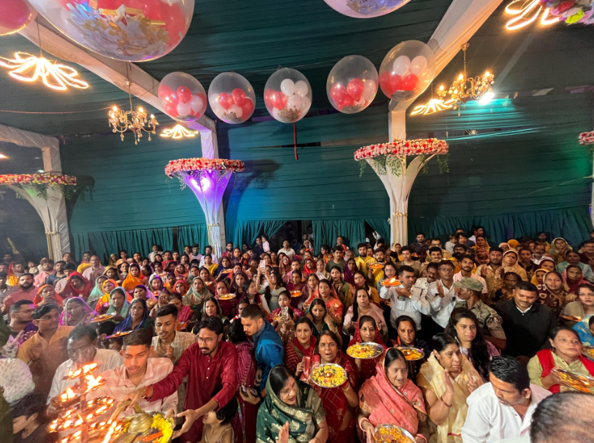 पूरे पंडाल को फूलों और गुब्बारों से सजाया गया था। जैसे ही आरती पूर्ण हुई, छत पर सजे फूलों की वर्षा माता जी और भक्तों पर हुई। ढोल-नगाड़ों और बैंड की ताल पर भक्त झूम उठे और देर रात तक माता के भजनों में डूबे रहे।
