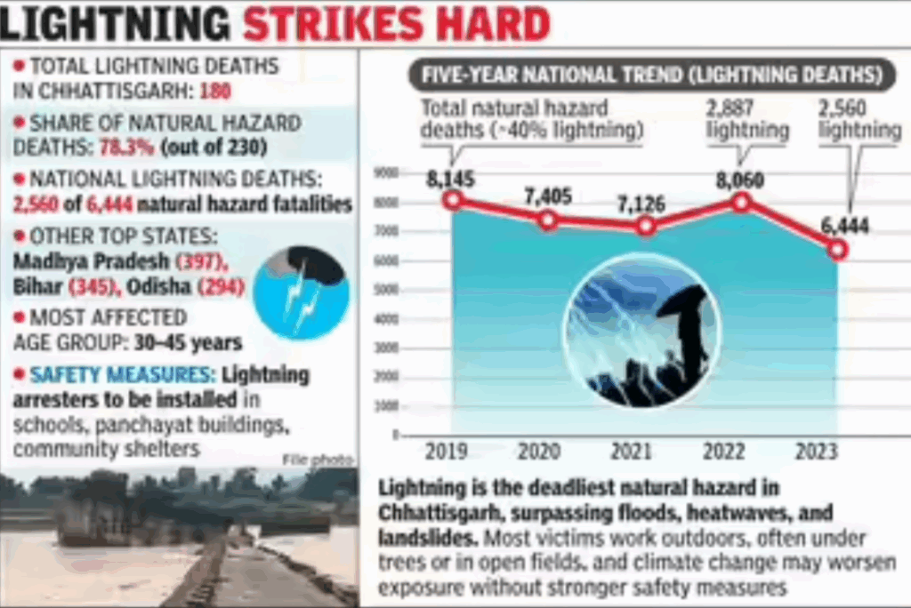 रिपोर्ट बताती है कि वर्ष 2023 में छत्तीसगढ़ में प्राकृतिक शक्तियों से कुल 230 लोगों की जान गई, जिनमें से ज्यादातर मौतें बिजली गिरने से हुईं। राष्ट्रीय स्तर पर भी बिजली सबसे घातक प्राकृतिक आपदा साबित हुई, जिसने 2,560 लोगों की जान ली। मध्यप्रदेश (397), बिहार (345) और ओडिशा (294) सबसे ज्यादा प्रभावित राज्य रहे।