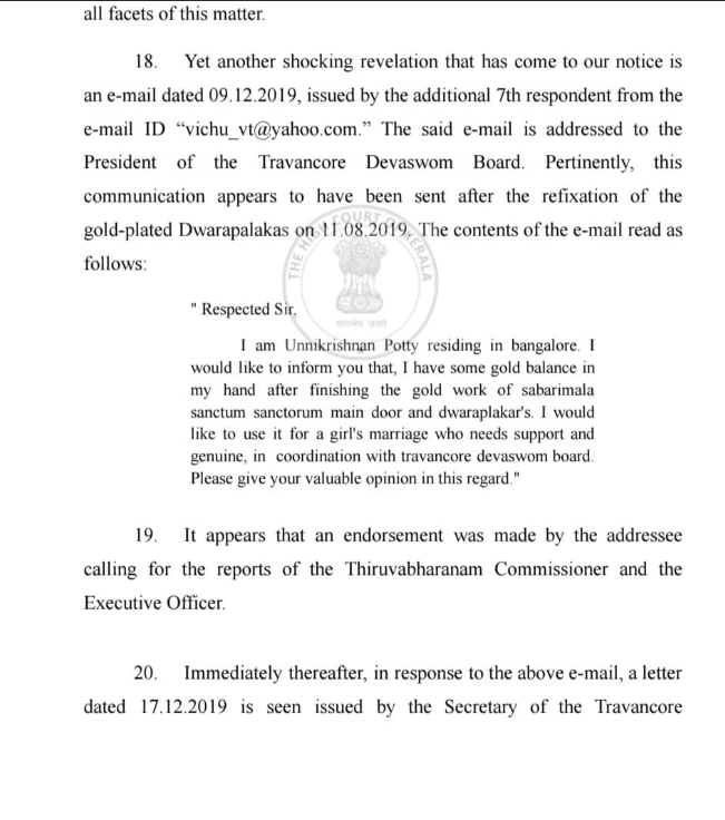 2019 में लिखे गए एक पत्र में उन्नीकृष्णन पोटी ने त्रावणकोर देवस्वम बोर्ड (TDB) को लिखा था —
