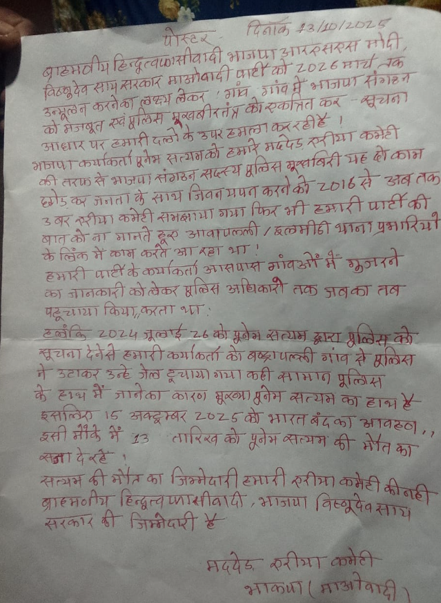 पर्चे में लिखा था कि सत्याम पूनेम पुलिस के लिए मुखबिरी कर रहा था और माओवादियों की गतिविधियों की जानकारी अधिकारियों तक पहुंचा रहा था। चेतावनी के बाद भी सहयोग जारी रखने पर उसे ‘सज़ा’ दी गई।