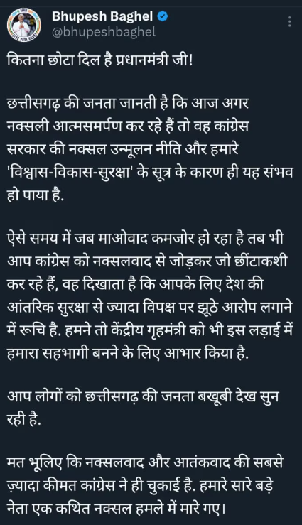 छत्तीसगढ़ की सियासत एक बार फिर गर्मा गई है। पूर्व मुख्यमंत्री भूपेश बघेल ने प्रधानमंत्री नरेंद्र मोदी के हालिया ट्वीट पर तीखी प्रतिक्रिया दी है। प्रधानमंत्री द्वारा नक्सलवाद पर दिए बयान को लेकर बघेल ने कहा —