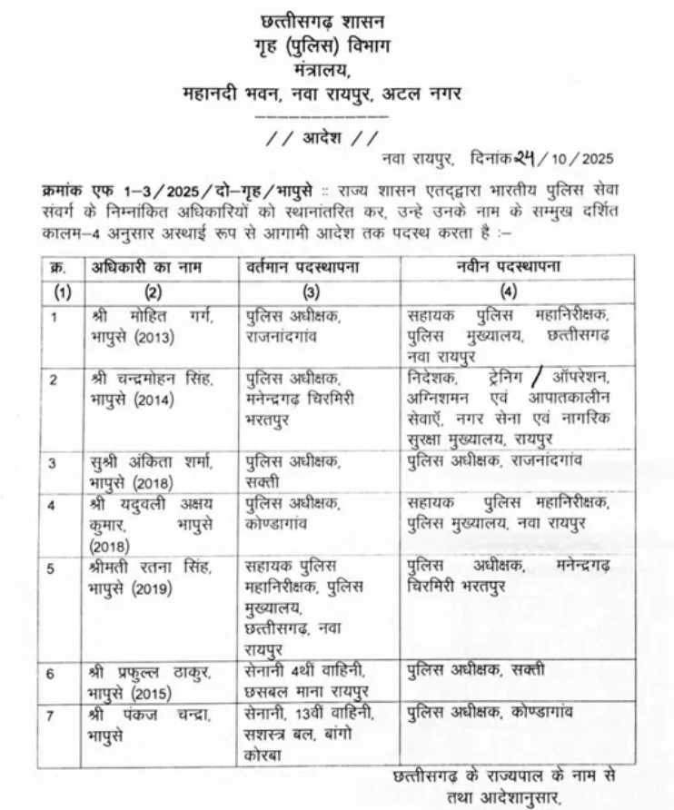 इसके अलावा, आईपीएस पंकज चंद्रा को कोंडागांव जिले का एसपी, प्रफुल्ल ठाकुर को सक्ती जिले का एसपी और रतना सिंह को मनेंद्रगढ़-चिरमिरी-भरतपुर जिले का एसपी बनाया गया है।