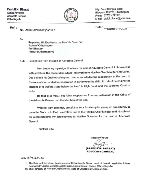रायपुर। छत्तीसगढ़ के महाधिवक्ता (Advocate General) और वरिष्ठ अधिवक्ता प्रफुल्ल भरत ने अपने पद से इस्तीफा दे दिया है। उनका इस्तीफा 17 नवंबर से प्रभावी माना गया है। भरत ने अपना त्यागपत्र राज्यपाल को भेजते हुए सरकार, मुख्यमंत्री और प्रशासनिक अधिकारियों के प्रति गहरी कृतज्ञता व्यक्त की है।