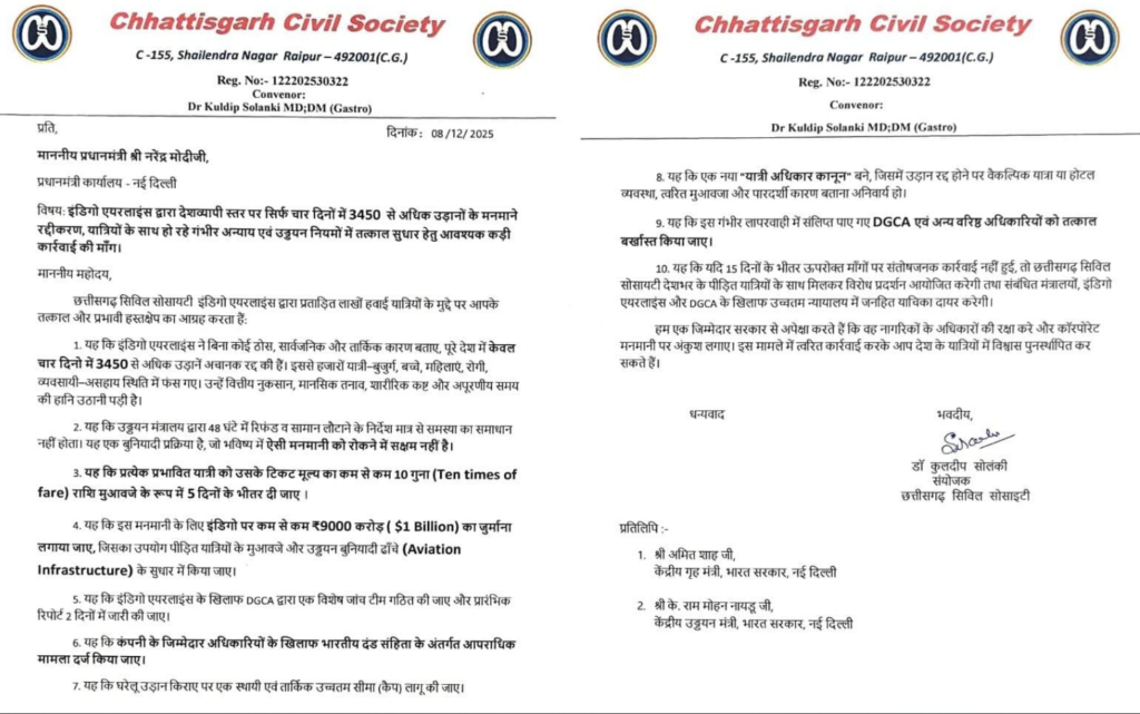 IndiGo flight cancellations: छत्तीसगढ़ सिविल सोसायटी ने बताया कि पीड़ित यात्रियों की ओर से प्रधानमंत्री, केंद्रीय गृह मंत्री और केंद्रीय नागरिक उड्डयन मंत्री को विस्तृत शिकायत भेजी जा चुकी है।