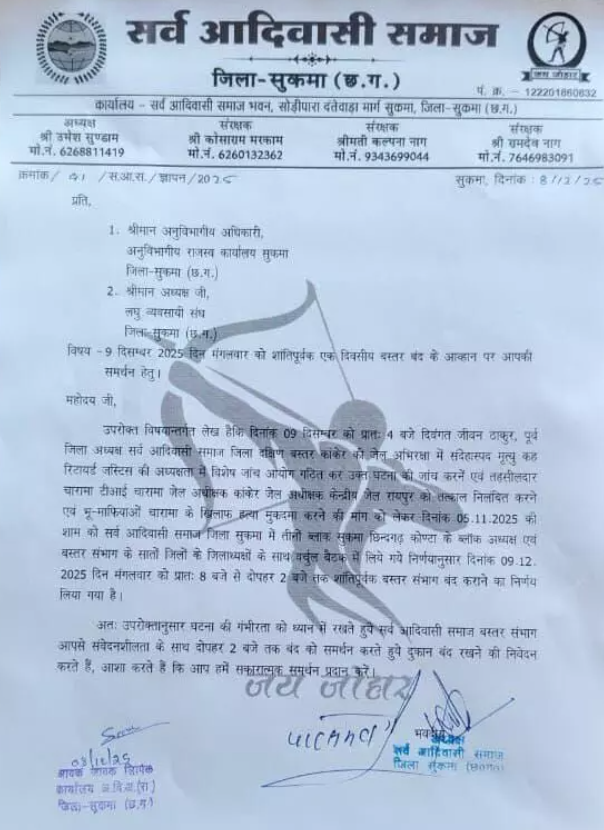 सुकमा में भी सर्व आदिवासी समाज की अपील का व्यापक असर दिखा और नगर के सभी व्यापारी संगठित रूप से बंद में शामिल हुए।
